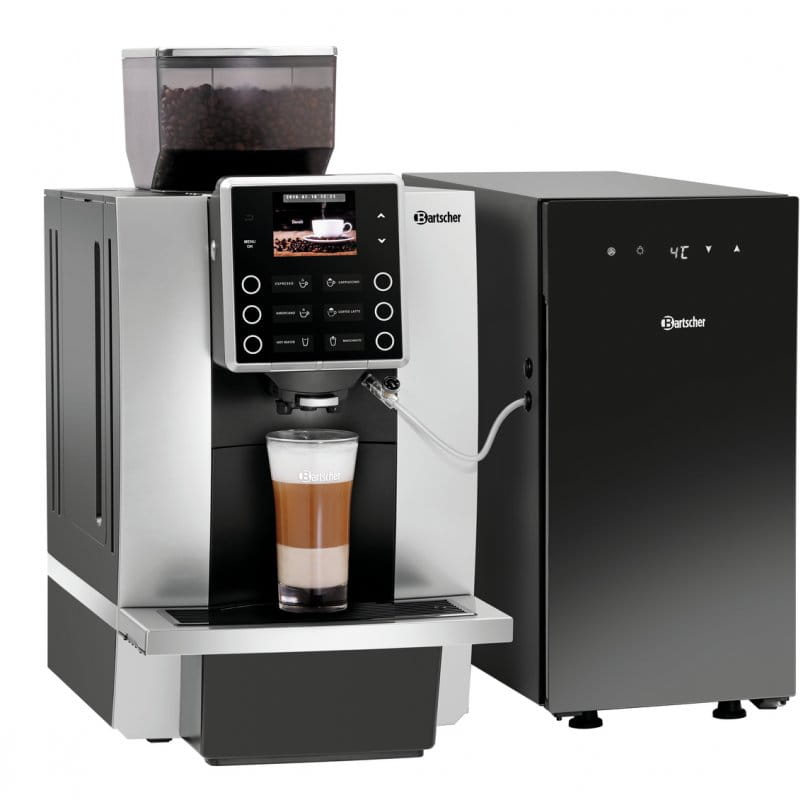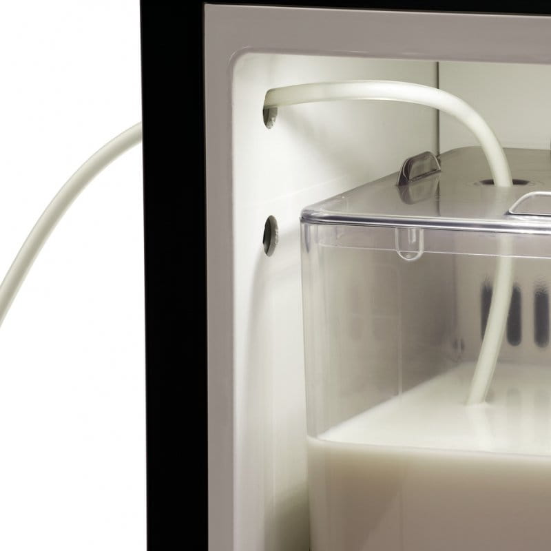Praktyczna lodówka na mleko zapewni bezpośredni dostęp do schłodzonego mleka dzięki bocznym otworom na wężyk. Schłodzone mleko jest przechowywane w higienicznych warunkach i w razie potrzeby może zostać pobrane bezpośrednio do przygotowania kawy za pomocą wężyka do mleka, w który wyposażony jest ekspres.